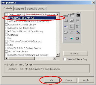 Kedua, tambahkan komponen vb skinner melalui Project -> Components atau melalui tombol CTRL + T kemudian berikan tanda centang sehingga komponen vb skinner muncul dalam daftar komponen sebelah kiri project.